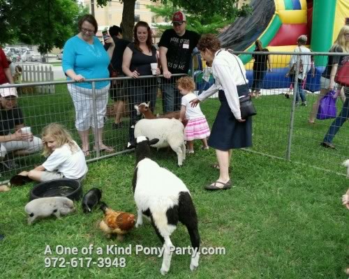 Our Dallas pony parties and petting zoos have something to please every child (young or old)! We do all the work... we will transport the cute country critters to your location, set up and oversee the event. Then we tear down and cleanup after our petting zoos and ponies during and after your event. We can accommodate Private Parties, Weddings, Grand Openings, Churches, Schools, Day Care, Carnivals and MORE!!